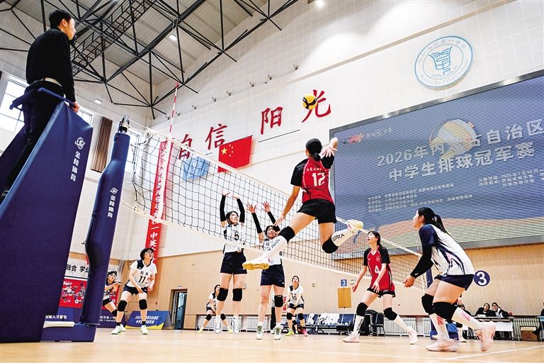 1月28日,呼和浩特市第一中學排球館內,隊員們正在賽場上激烈角逐。1月26日,2026年內蒙古自治區中學生排球冠軍賽激情開賽,比賽為期8天。此次比賽由自治區教育廳、體育局聯合主辦,呼和浩特市教育局承辦,作為自治區頂級中學生排球賽事,吸引了來自9個盟市的47支代表隊、882人參賽。草原云·內蒙古新聞網記者 王曉博 攝