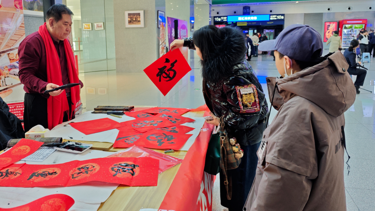 活動現場,熱情的舞蹈與悠揚的歌聲交織演繹,讓旅客的候車時光彌漫著濃厚的文化氛圍。一旁的書法家們揮毫潑墨、筆走龍蛇,將一句句美好的新春祝福化作一幅幅火紅的對聯和“福”字。許多旅客駐足排隊,期待將這份帶著墨香的獨特年味帶回家中,為佳節增添喜慶。