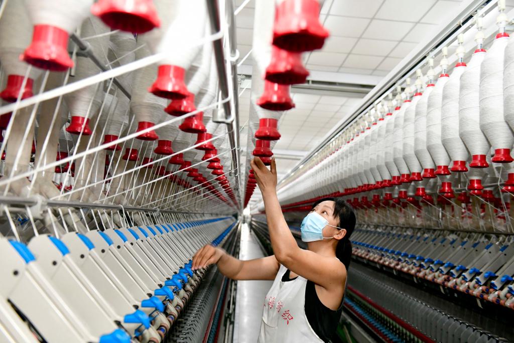 在山東省菏澤市鄆城縣藍翔紡織有限公司,工作人員在織機前忙碌(2025年3月12日攝)。新華社記者 郭緒雷 攝