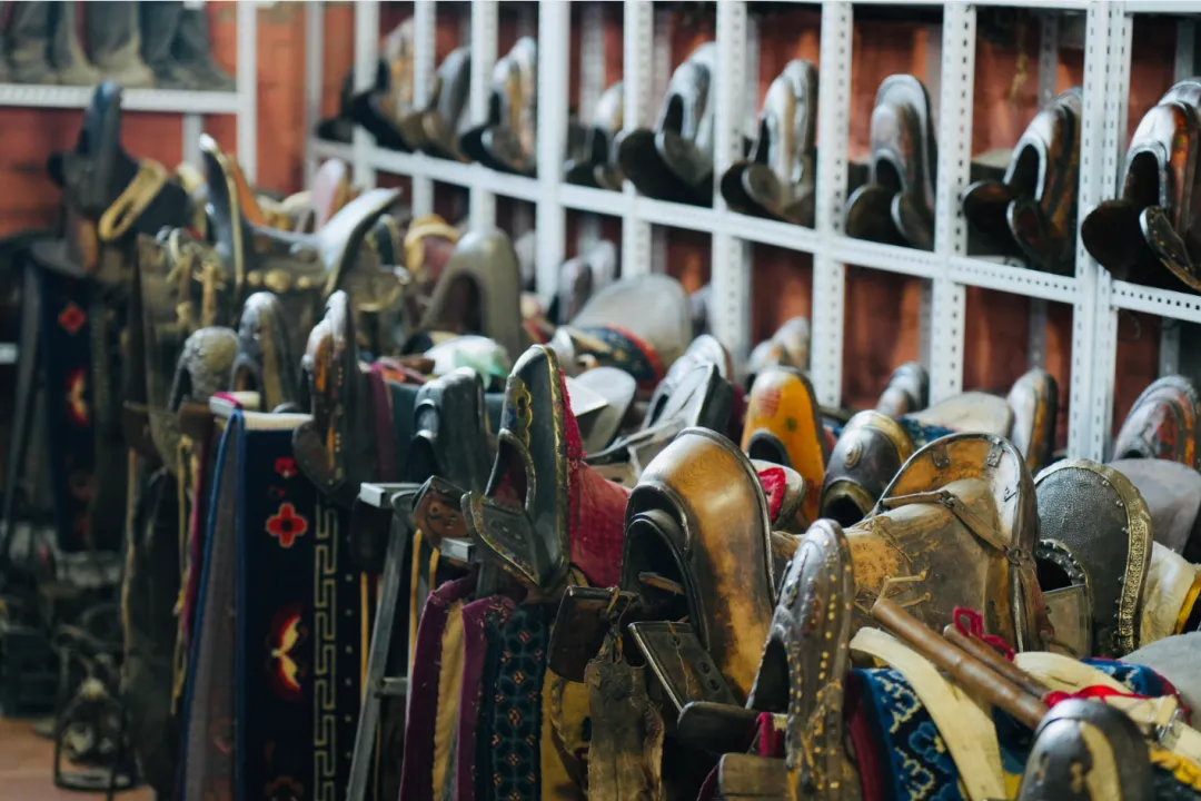 如今,楊潤的馬文化收藏展覽館已初具規模,建設好后也會免費向市民和游客開放,讓更多人近距離感受馬文化的底蘊。走進館內,最前方陳列著各類與古代馬文化關聯的古兵器,如《三國演義》中出現的呂布的方天畫戟、桃園三結義及五虎上將騎馬征戰時所用的長槍、大刀等,都是清代、民國前的古兵器,仿佛能讓人窺見古代將士策馬揚鞭、馳騁沙場的壯闊場景。往里走,各式各樣的馬鞍、馬凳整齊陳列,搭配不同民族的裝飾紋樣,讓人仿佛穿越千年,窺見不同時代、不同地域的人文風貌。這些藏品涵蓋內蒙古、新疆、云南、青海等多個地區,囊括了不同民族的工藝特色,跨越多個年代。